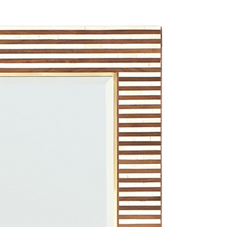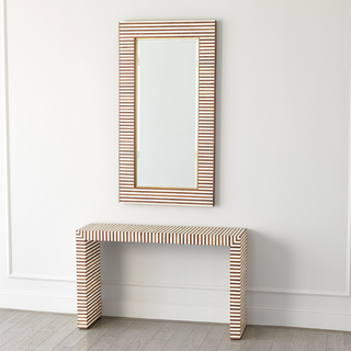 The Sienna Mirror showcases the beauty of natural materials through its striking pattern of alternating walnut wood, bone, and mango wood. Finished with a natural lacquer, this handcrafted piece highlights rich textures and warm tones, bringing artisanal character to any room. Its geometric detailing makes it a versatile accent, perfect for adding depth and sophistication to modern, rustic, or eclectic interiors.